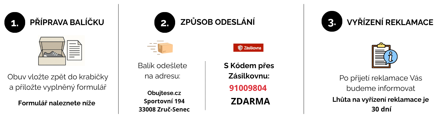 Při reklamaci zboží prosím vyplňte reklamační formulář a zboží odešlete na Adresu: Obujtese.cz, Sportovní 194, 33008 Zruč-Senec nebo využijte náš kód přes Zásilkovnu Zdarma!
