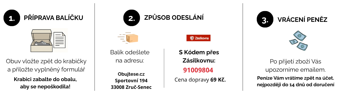 Obuv vložte zpět do krabičky a přiložte vyplněný formulář. Krabici zabalte tak aby se nepoškodila! Zboží lze vrátit jakýmkoliv dopravcem na adresu: Obujtese.cz Sportovní 194, 33008 Zruč-Senec