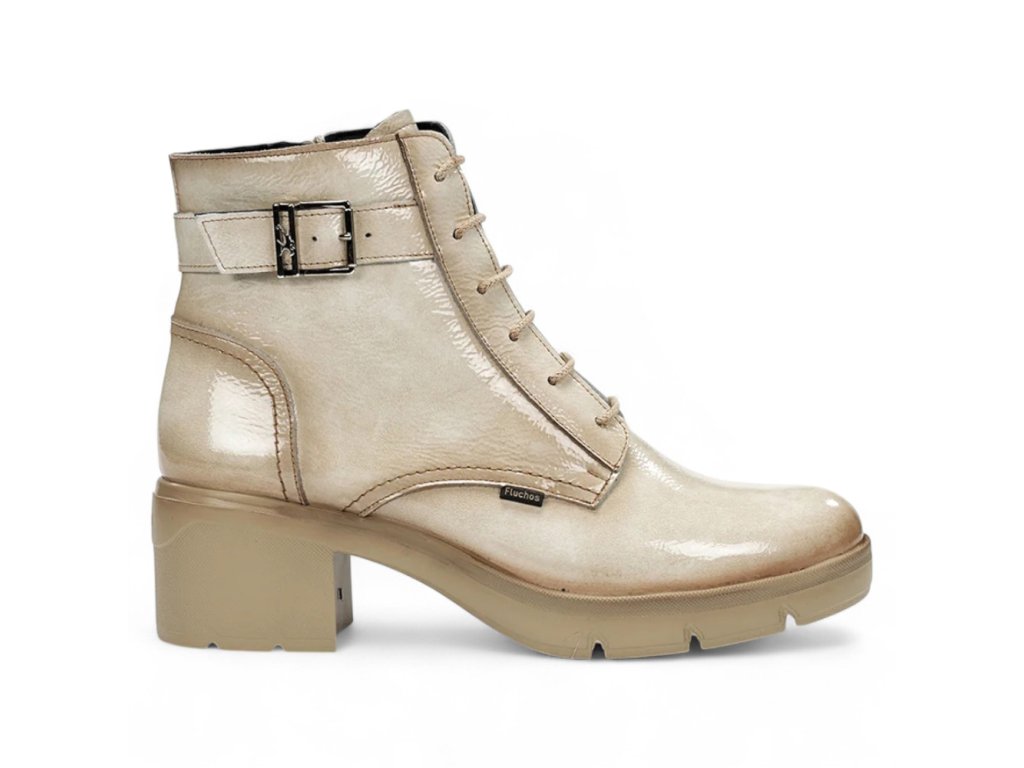Dámské kotníkové boty FLUCHOS na pohodlném podpatku. Lakový vzor zaujme na první pohled. Jsou pohodlné na noze díky širokému podpatku.