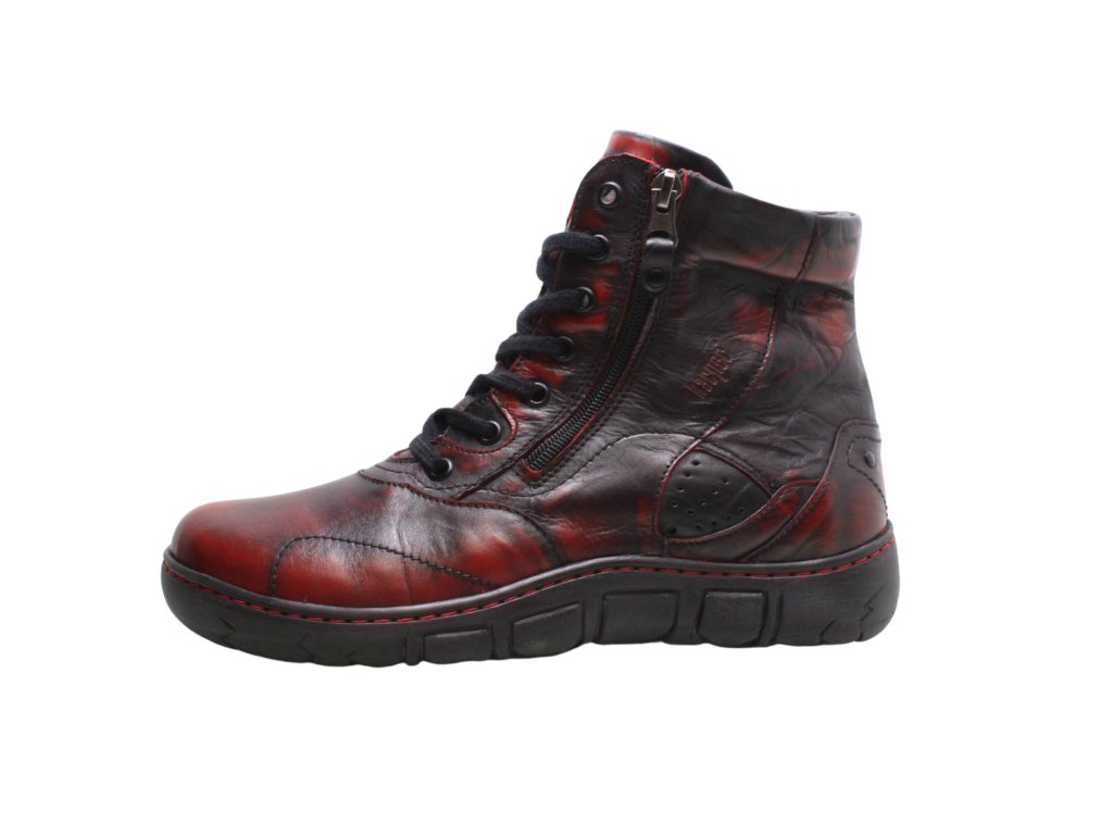 Dámske členkové topánky Kacper na pohodlnej platforme so šnurovaním. Kožený vzor sa ľahko prispôsobí nohe. Vďaka guľatej špičke sú vhodné aj na širšiu nohu. Ozdobné šnurovanie s logom značky dodáva topánkam šmrnc.