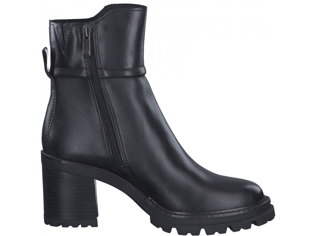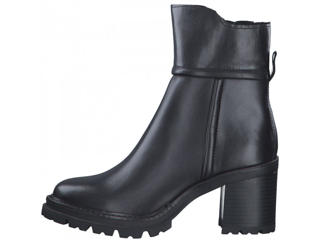 Dámské kotníkové boty Marco Tozzi na širším podpatku s protiskluzen. Hladký černý vzor vypadá elegantně. Díky zipu po straně jsou snadno prozutelné. Ozdobné prošívání v horní části dává botám šmrnc.
