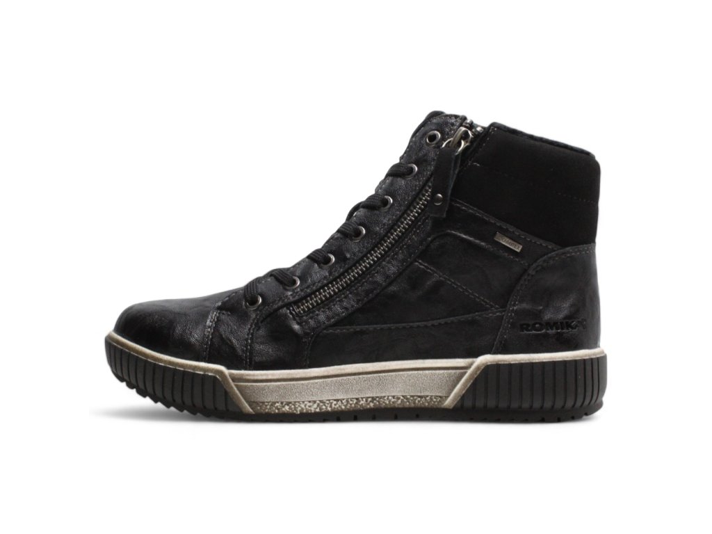 Dámské kotníkové boty Romika na pohodlné platformě. Díky membráně jsou odolné proti vodě. Díky zipu po straně se snadno obouvají.