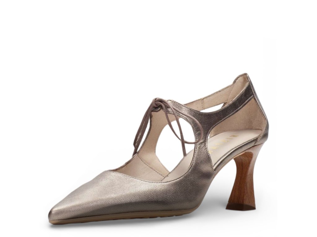 Dámské lodičky Hispanitas na elegantním podpatku. Hladký Překřížené pásky se šněrováním zaujmou na první pohled. Boty mají taupe metalový vzor.