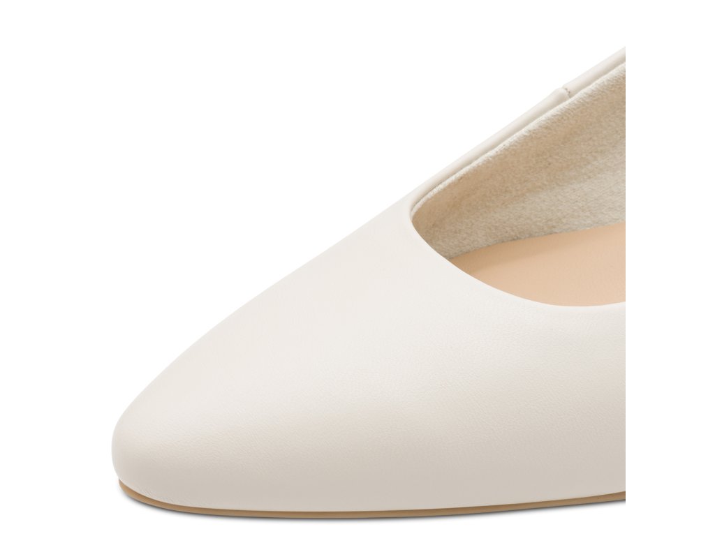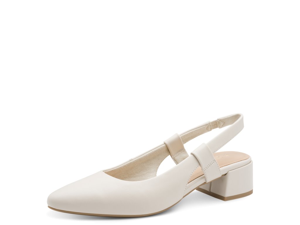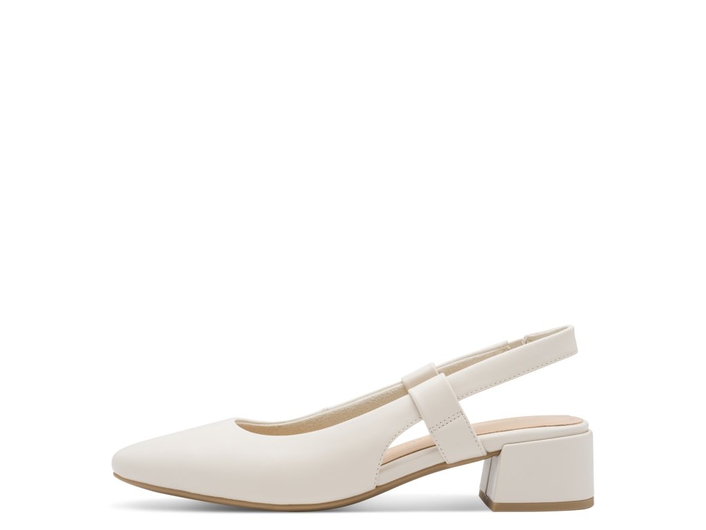 Dámské lodičky Marco Tozzi bez paty. Béžový vzor je snadno sladitelný. Boty mají pohodlná podpatek.
