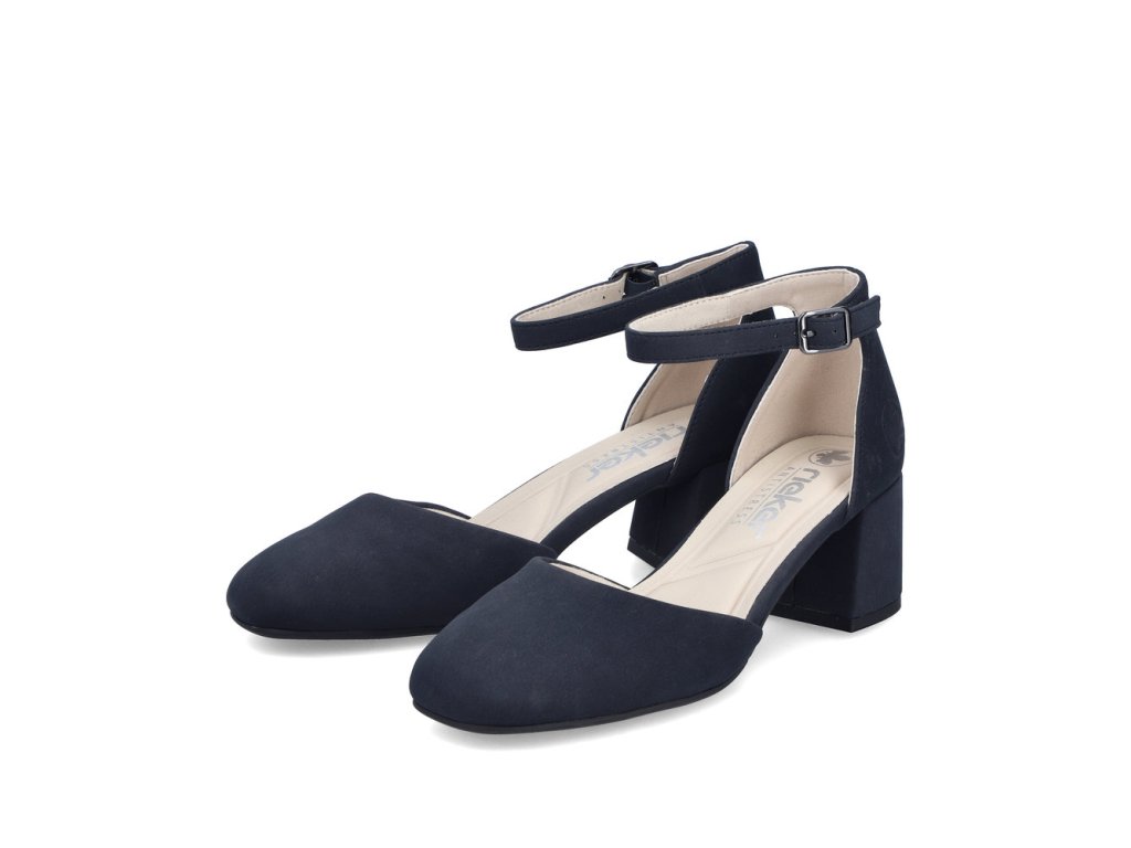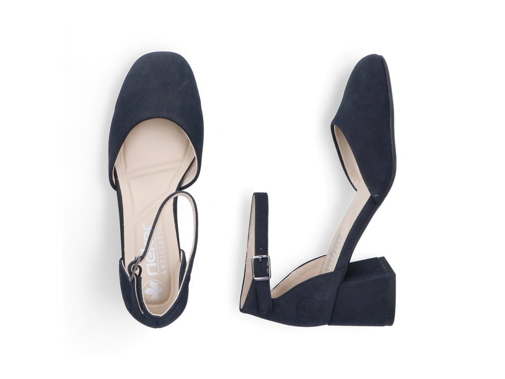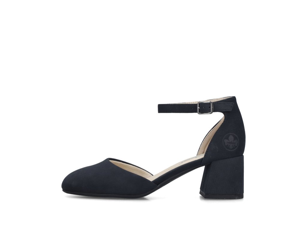 Dámské lodičky Rieker 44762-14 v tmavě modrém provedení zaujmou otevřenou patou a páskem kolem kotníku s přezkou, který dodává botám elegantní vzhled a zároveň zajišťuje stabilitu při chůzi. Blokový podpatek je ideální pro pohodlné nošení do práce i na společenské příležitosti.
