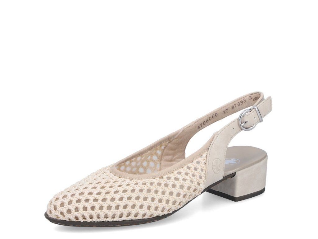Dámské lodičky Rieker 47060-60 v jemném krémovém odstínu zaujmou lehkým letním vzhledem a důrazem na pohodlí. Prodyšný textilní svršek v síťovaném provedení zajišťuje výbornou cirkulaci vzduchu, zatímco otevřená pata s nastavitelnou přezkou umožňuje přesné přizpůsobení noze. Nízký blokový podpatek dodává stabilitu a komfort při chůzi, takže jsou ideální volbou pro každodenní nošení i elegantnější příležitosti v teplejších dnech.
