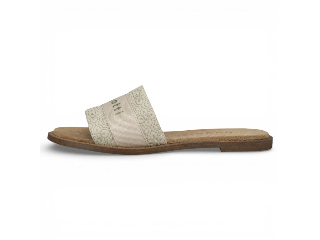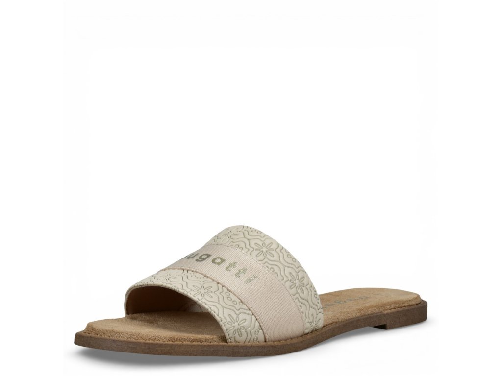 Dámské pantofle Bugatti v béžovo-zlatém provedení zaujmou jemným vzorem a pružným páskem s logem. Lehké letní nazouváky s plochou podrážkou jsou ideální na každodenní nošení i dovolenou.