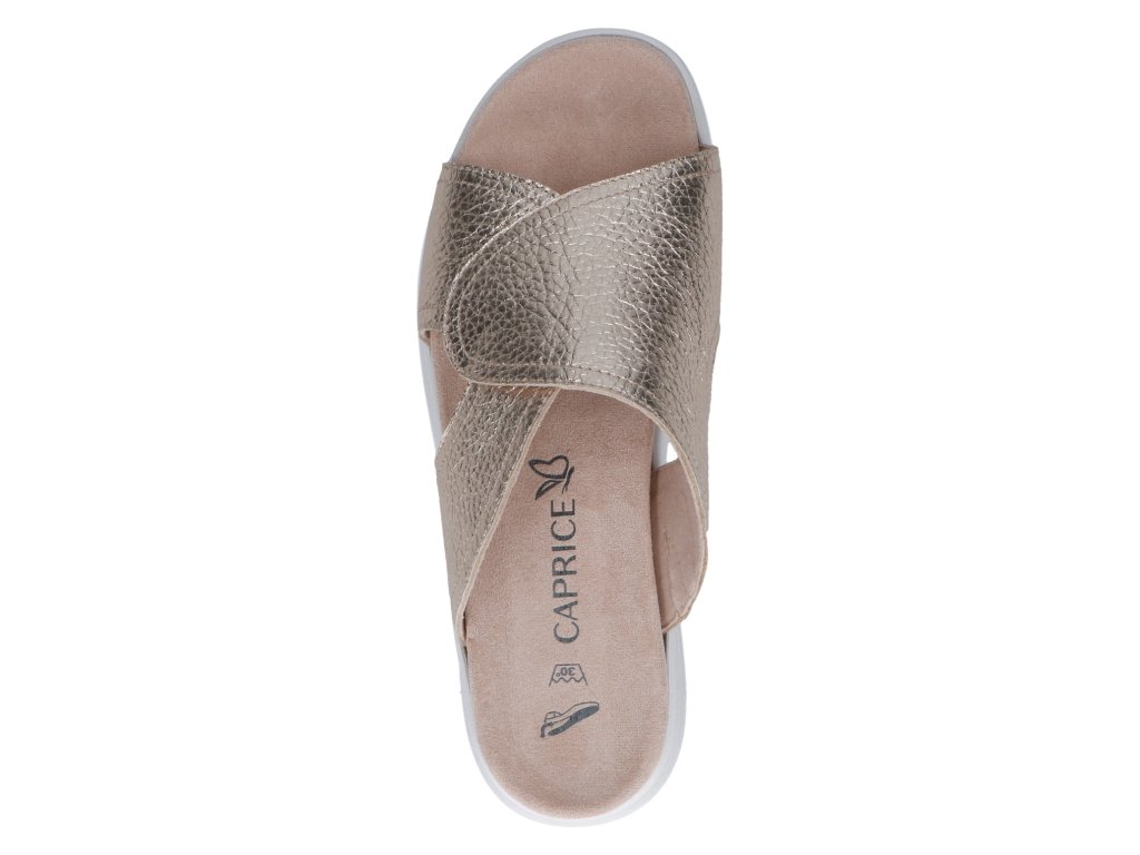 Dámské pantofle Caprice ve zlatém odstínu mají překřížené pásky v nártu s uchycením na suchý zip, což zajišťuje dobré držení na noze.