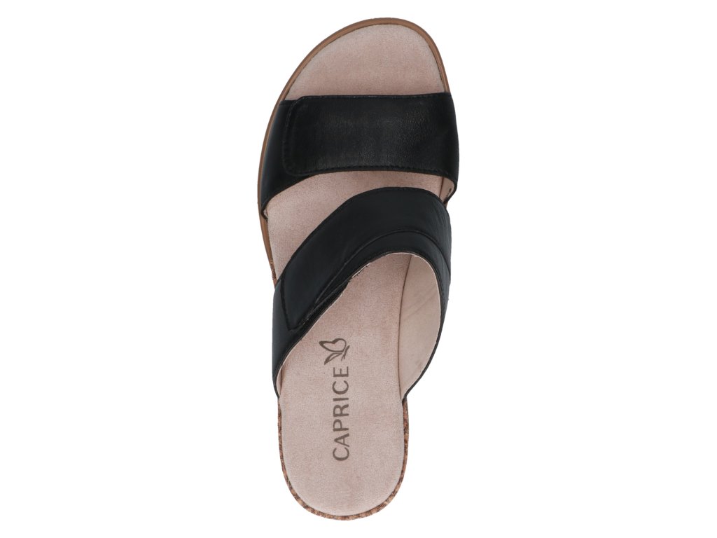 Dámské pantofle Caprice s dvěma pásky přes nárt, které jsou nastavitelné pomocí suchého zipu, což umožňuje přizpůsobit šířku obuvi různým typům nohy.