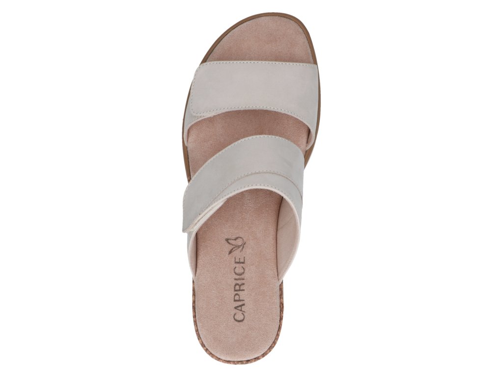 Dámské pantofle Caprice s dvěma pásky přes nárt, které jsou nastavitelné pomocí suchého zipu, což umožňuje přizpůsobit šířku obuvi různým typům nohy.