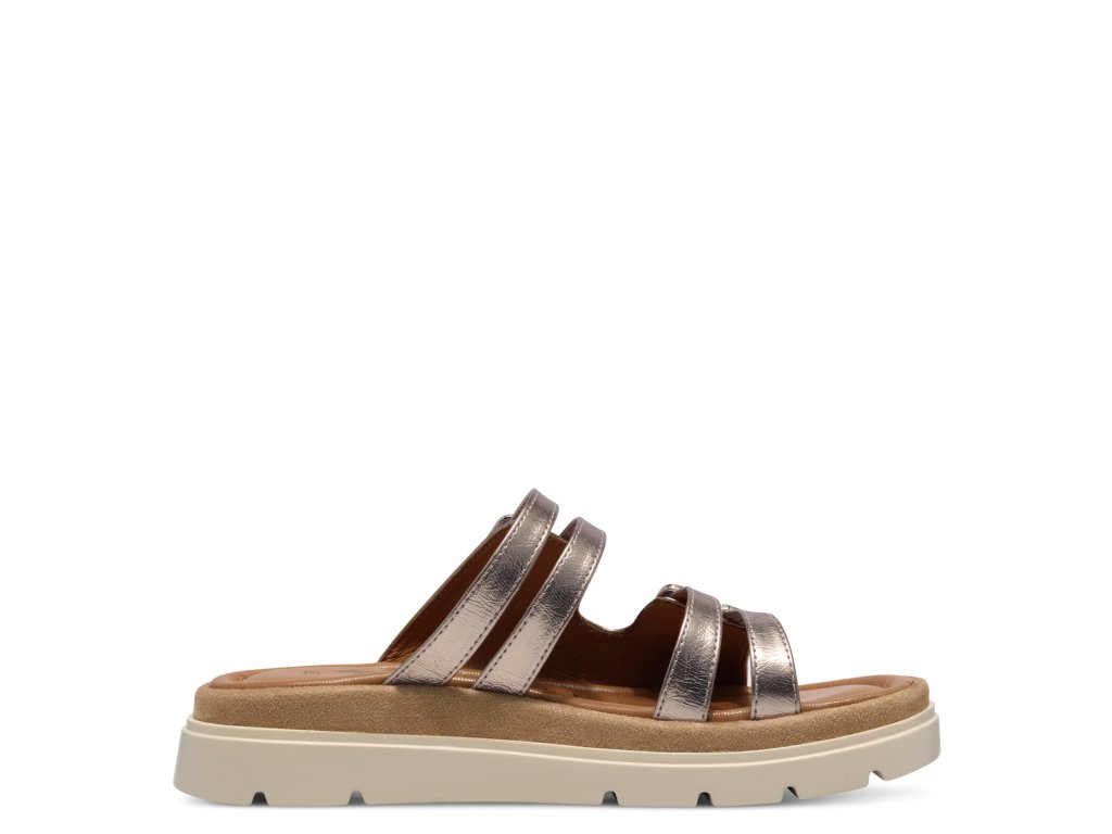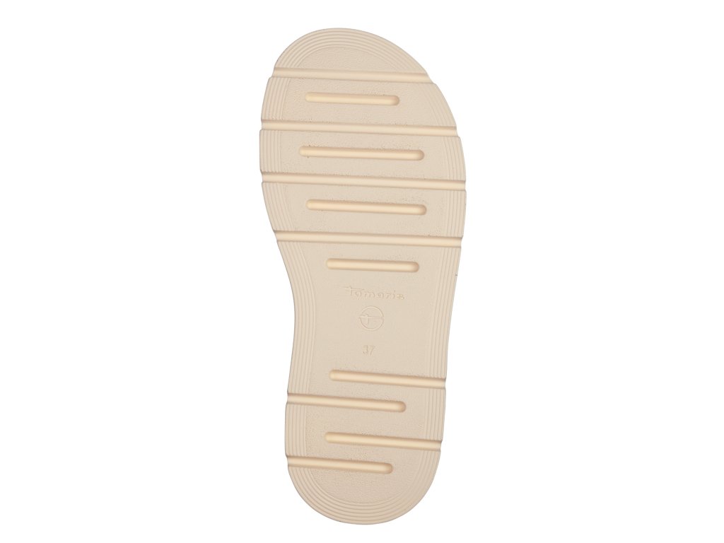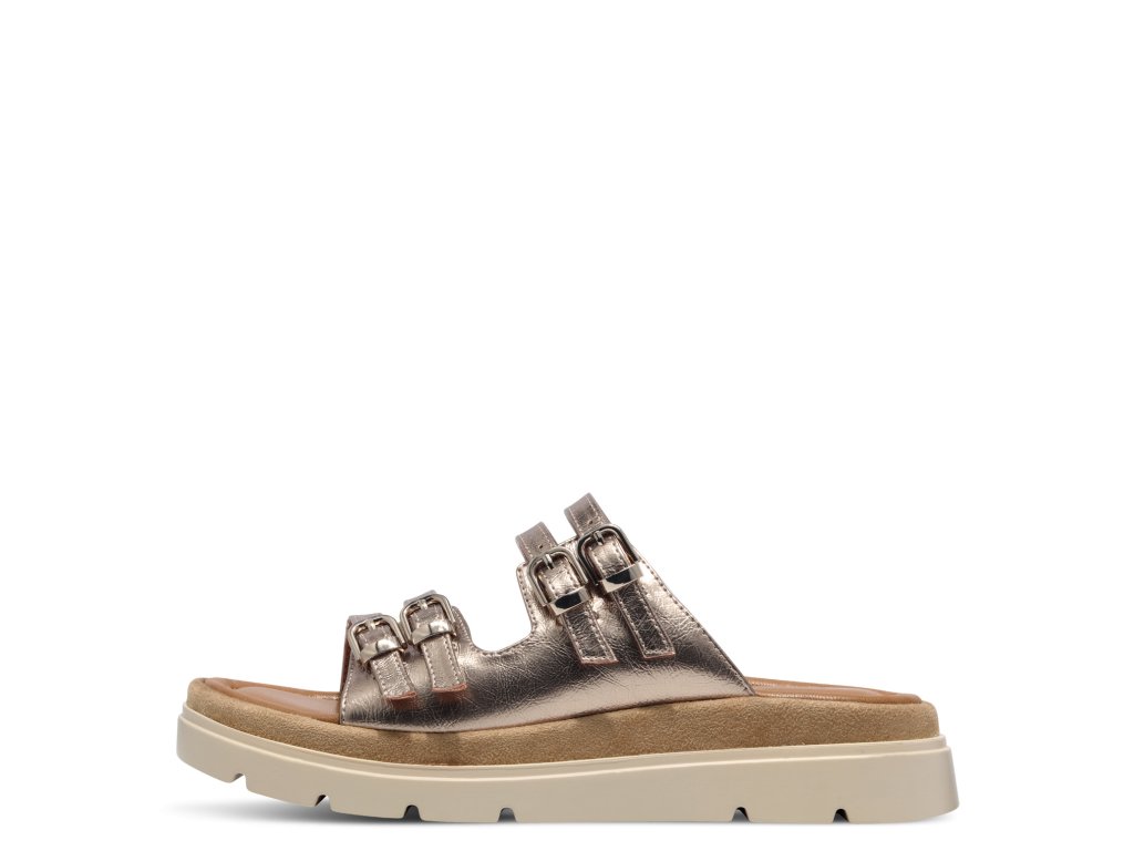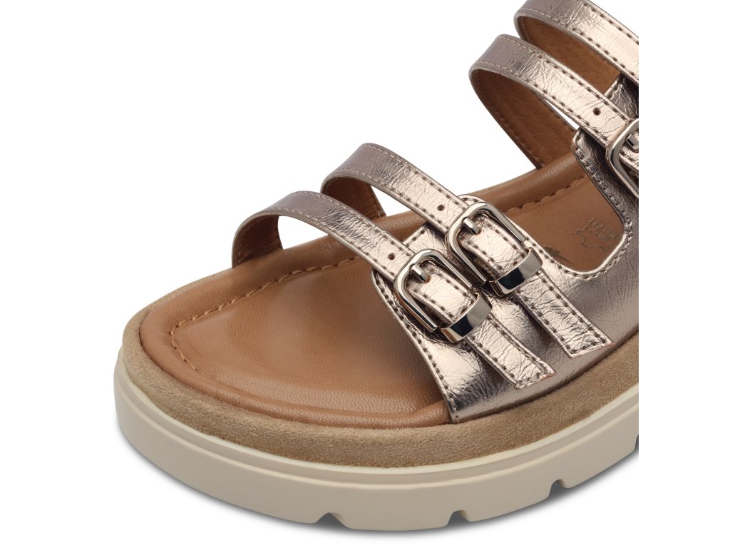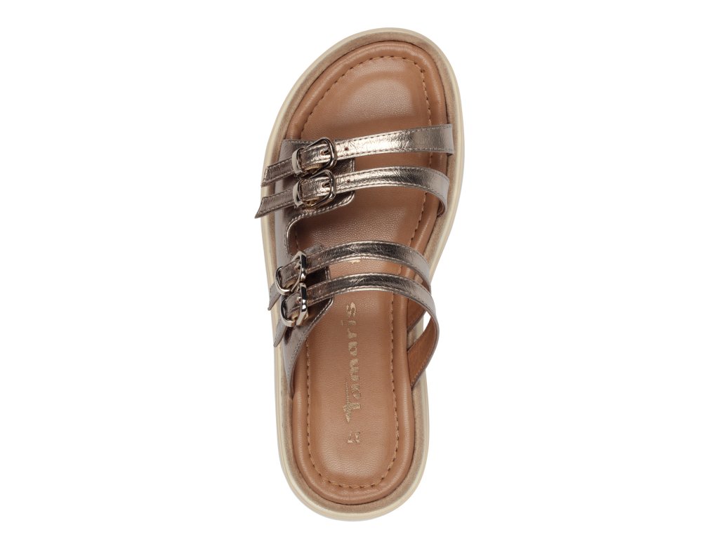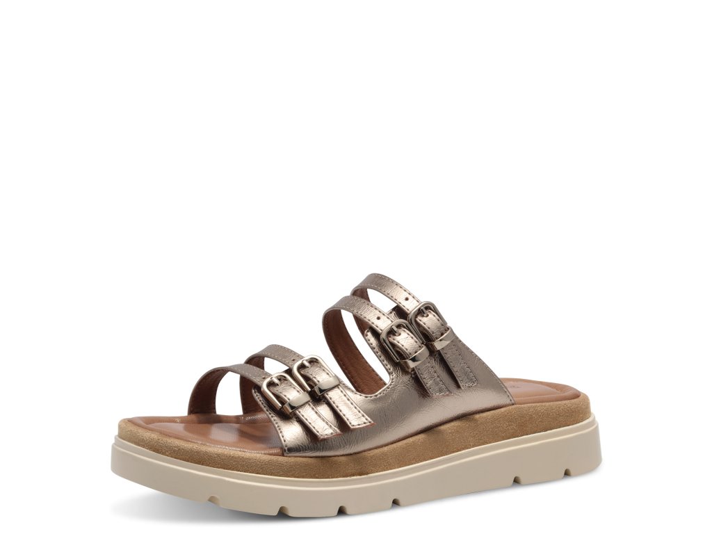 Dámské pantofle Tamaris na pohodlné platformě. Díky platformě a vyměkčeným stélkám Touch-it pantofle nikde netlačí a jsou pohodlné na noze. Bronzový vzor s pásky na sponu dává pantoflu šmrnc.
