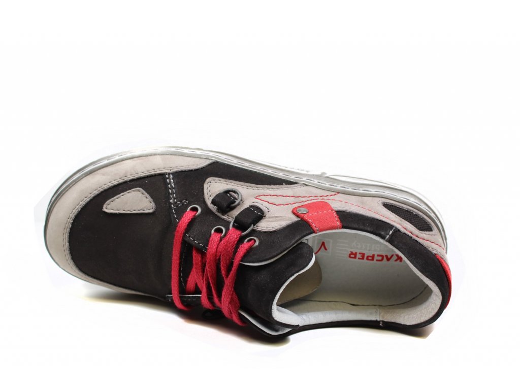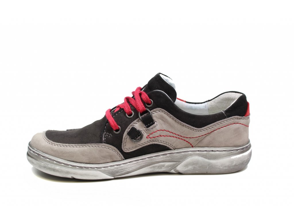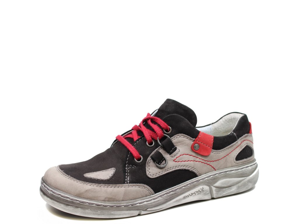 Dámské polobotky Kacper na pohodlné platformě se šněrováním. Kožený vzor se snadno přizpůsobí noze. Díky kulaté špičce jsou vhodné i na širší nohu. Červené doplňky na botě dodávají botám šmrnc.