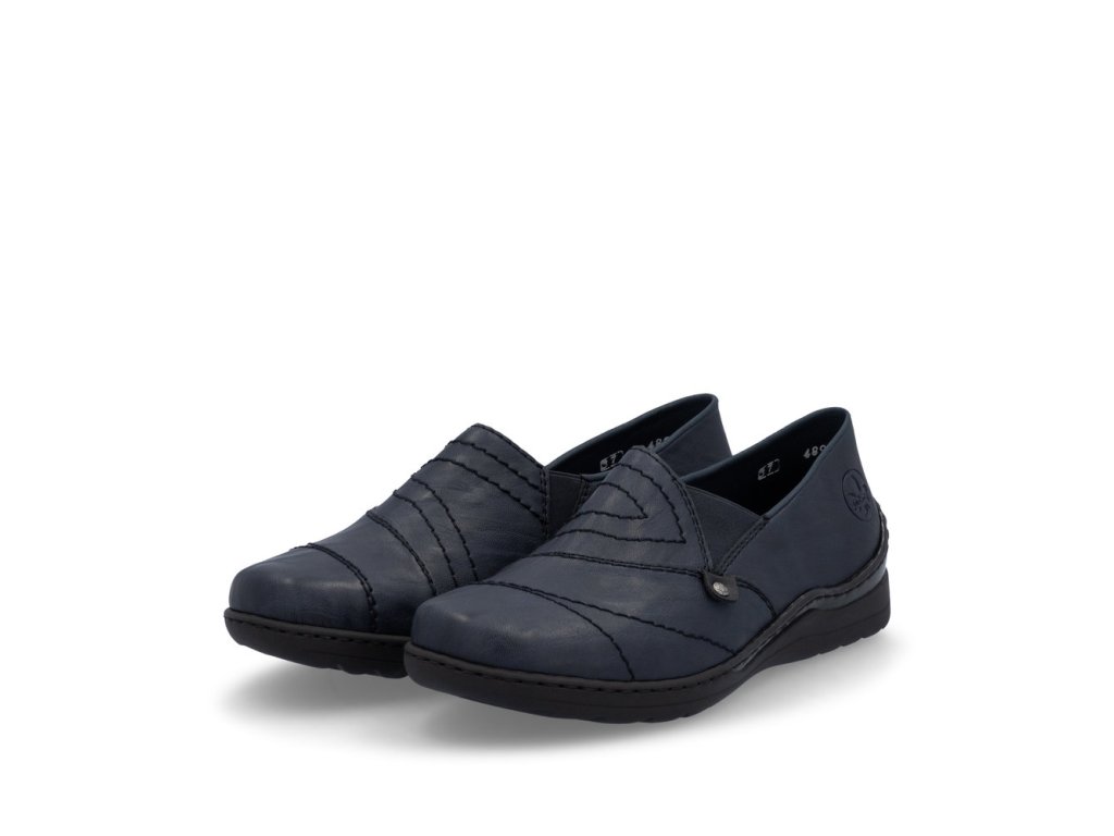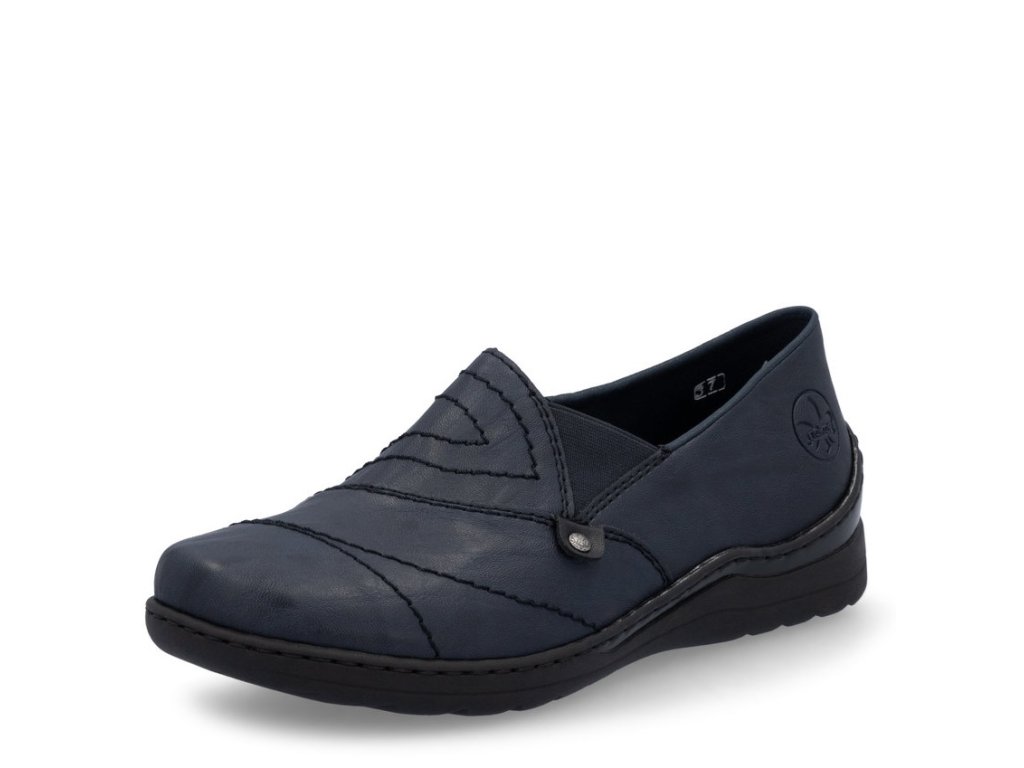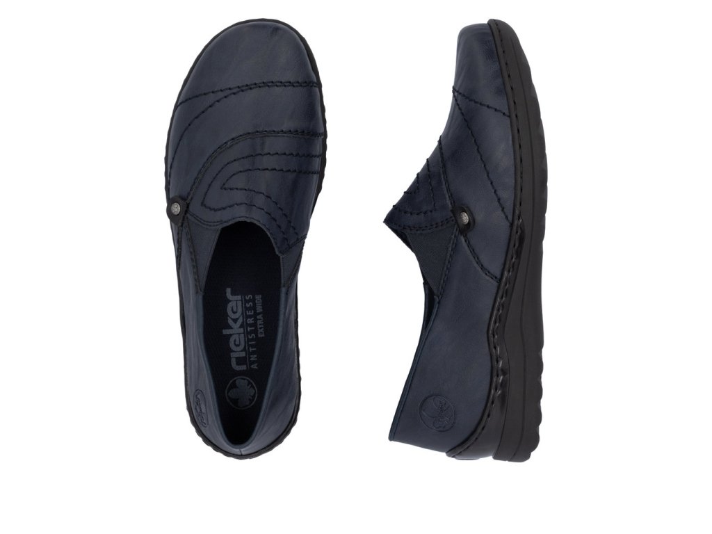 Dámské polobotky Rieker 48961-14 v modré barvě nabízejí maximální pohodlí díky extra měkké stélce a lehké tlumící podešvi. Model s extra šířkou H poskytuje dostatek prostoru v oblasti prstů a gumička přes nárt usnadňuje obouvání. Ideální volba pro každodenní nošení do práce i volného času.
