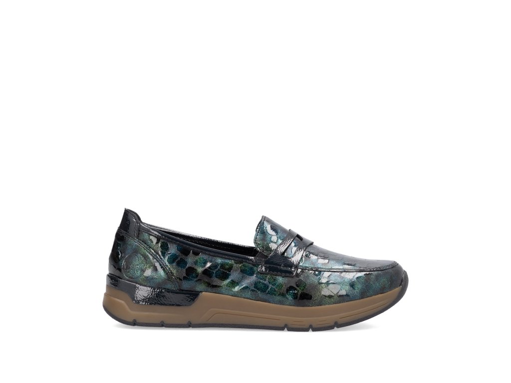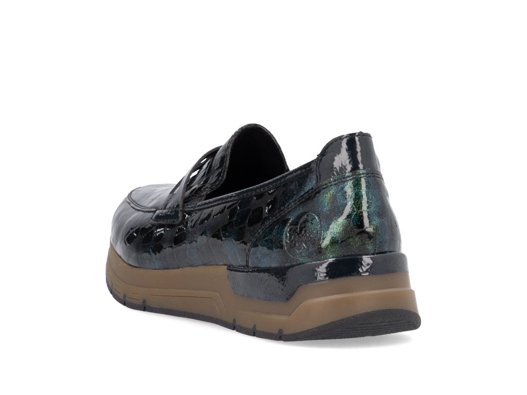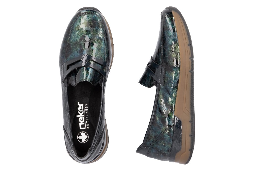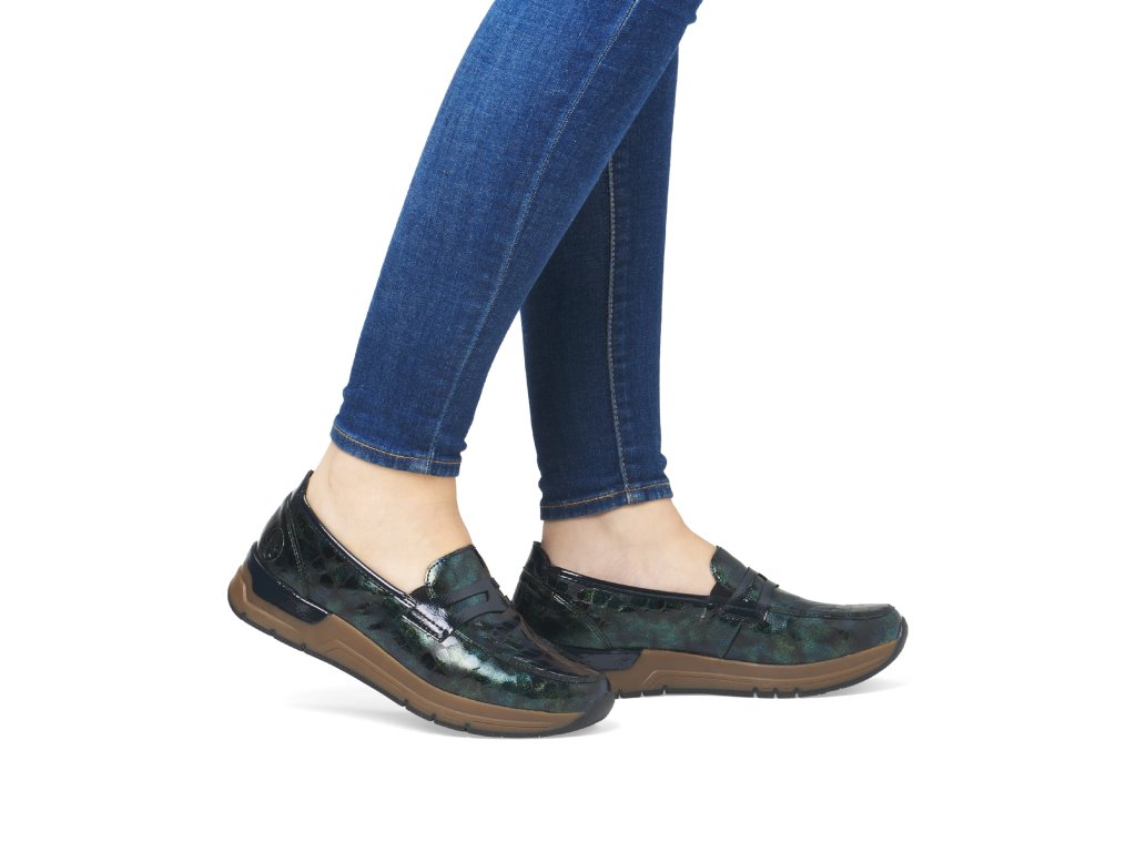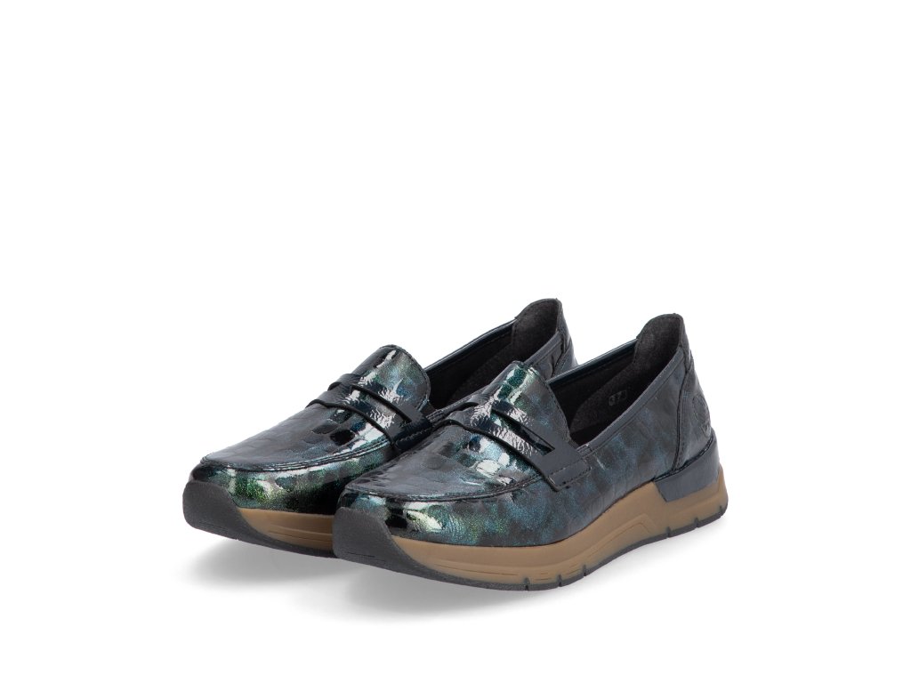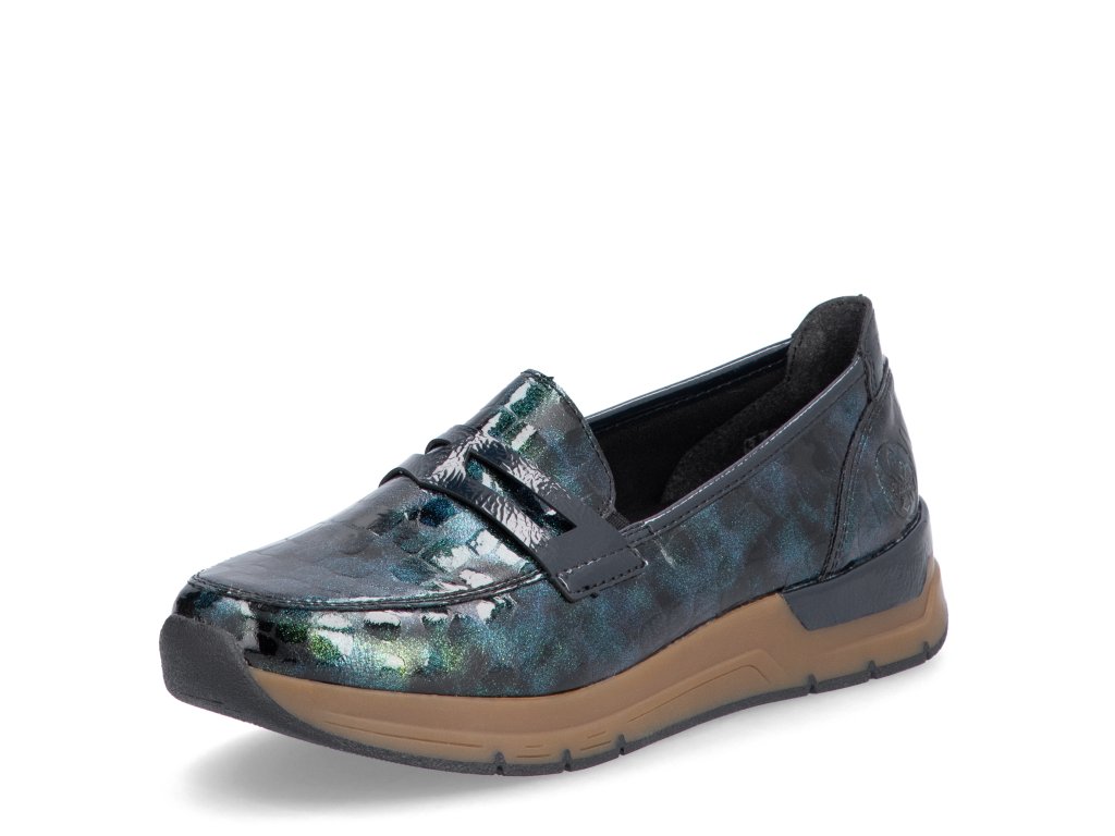 Dámské nazouvací polobotky značky Rieker na pohodlné platformě. Lakový barevný vzor dává botám šmrnc. Díky vnitřnímu materiálu perfektně sedí na noze a nikde netlačí. Platforma tlumení nárazy.