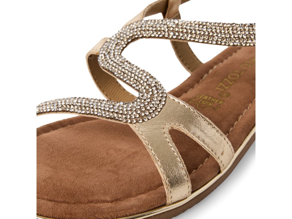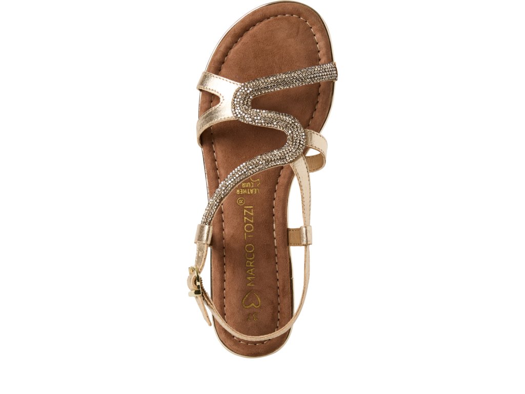 Dámské sandály Marco Tozzi s volnou patou a páskem ve tvaru S zdobeným kamínky.