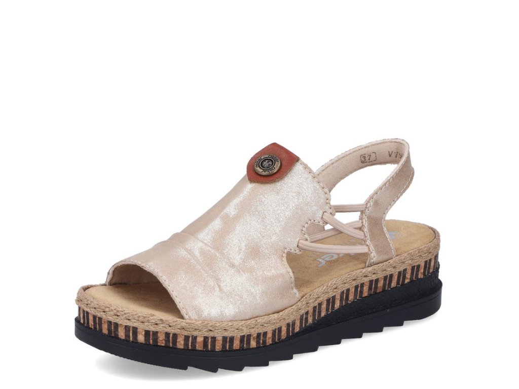 Dámské sandály Rieker V7972-60 na klínové platformě zaujmou jemně lesklým svrškem a přírodně laděnými detaily. Pružné pásky usnadňují obouvání, měkká stélka a lehká podešev se postarají o pohodlí při chůzi po městě i na dovolené.