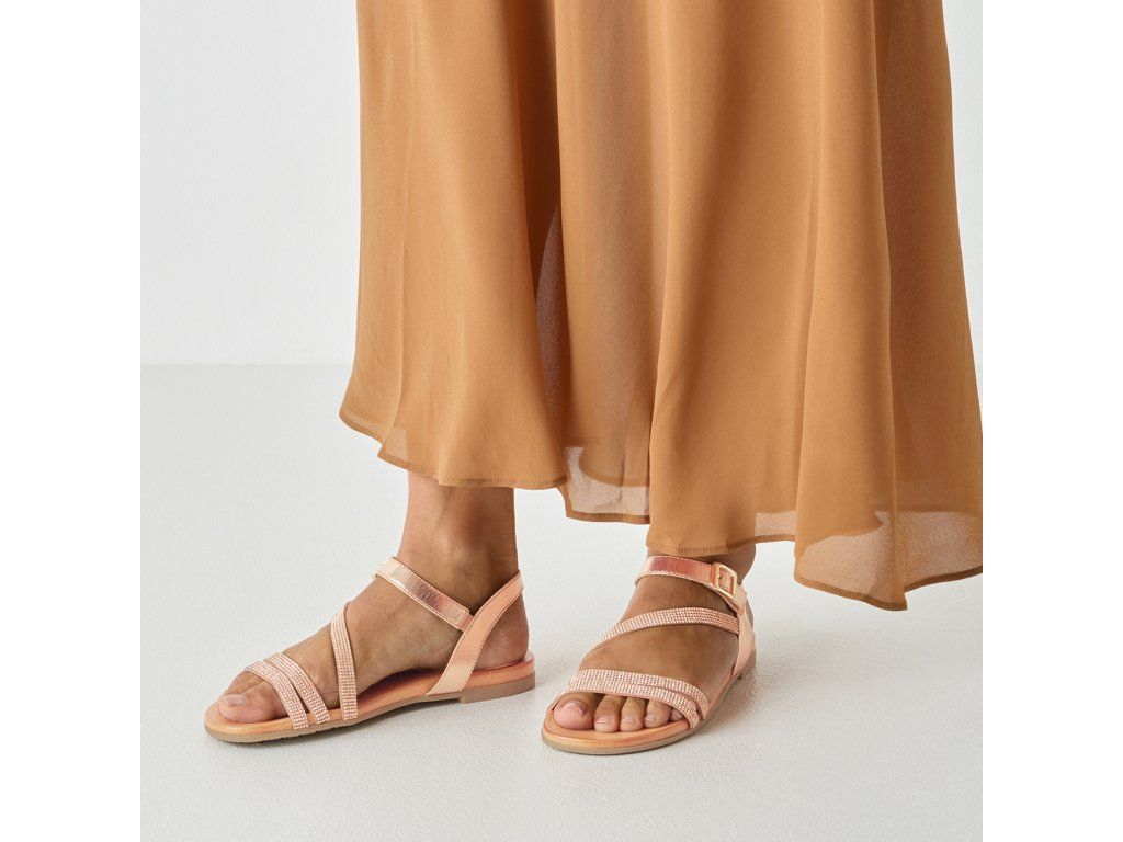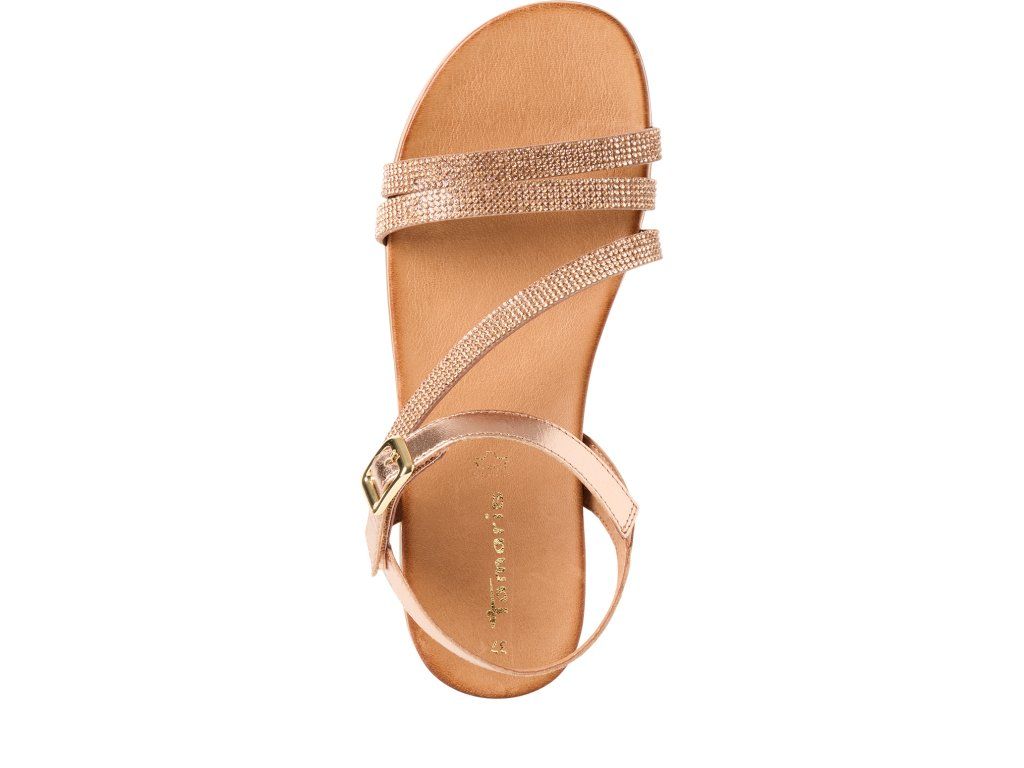 Dámské sandály Tamaris v růžově zlatém metalickém odstínu. Design tvoří tenké pásky překřížené přes nárt a pásek kolem kotníku se zapínáním na přezku, který zajišťuje bezpečné uchycení.