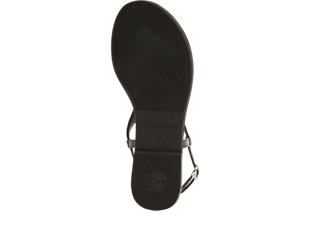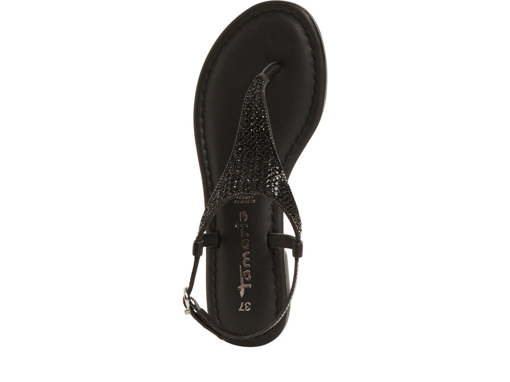Dámské sandály Tamaris s úzkým páskem zdobeným drobnými třpytivými kamínky, který vede mezi prsty nahoru na nárt, kde se spojuje s páskem kolem kotníku.