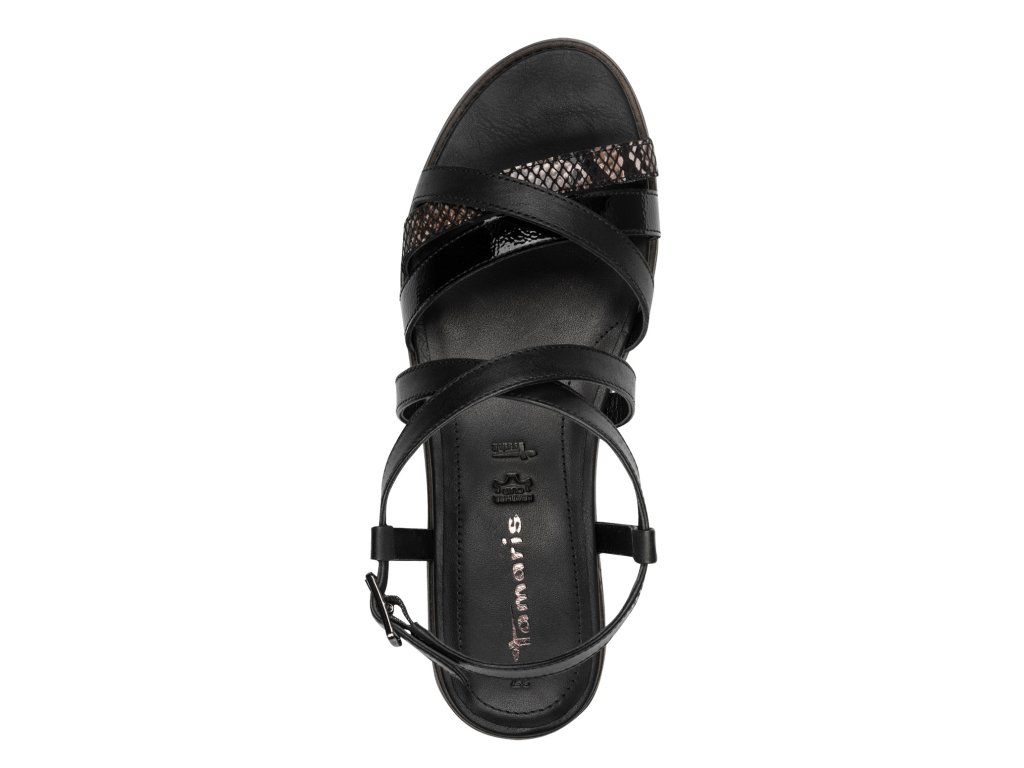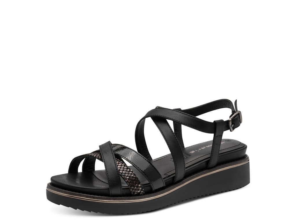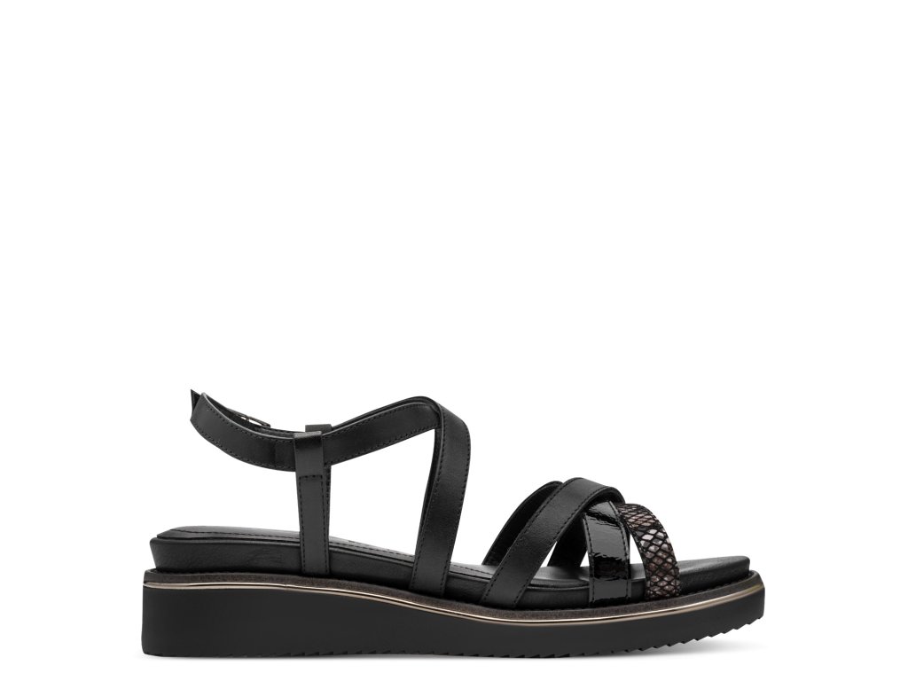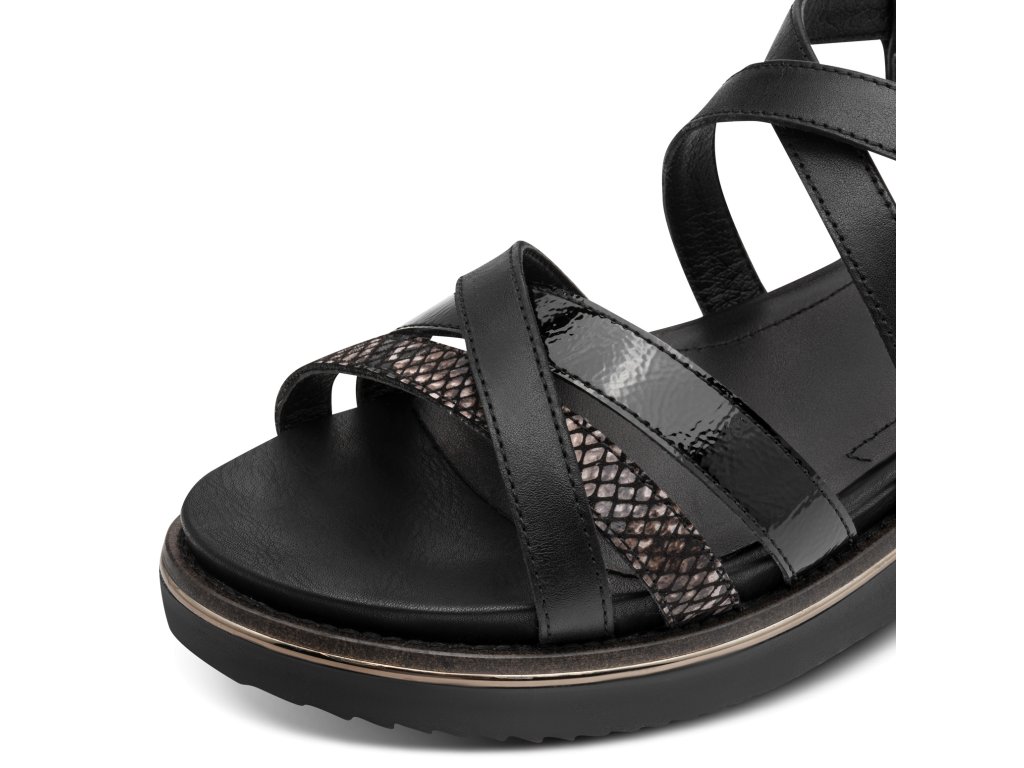 Dámské sandály Tamaris na bytelné platformě. Kombinace hladkých a texturovaných pásků (imitace hadí kůže) vytváří zajímavý vizuální prvek.