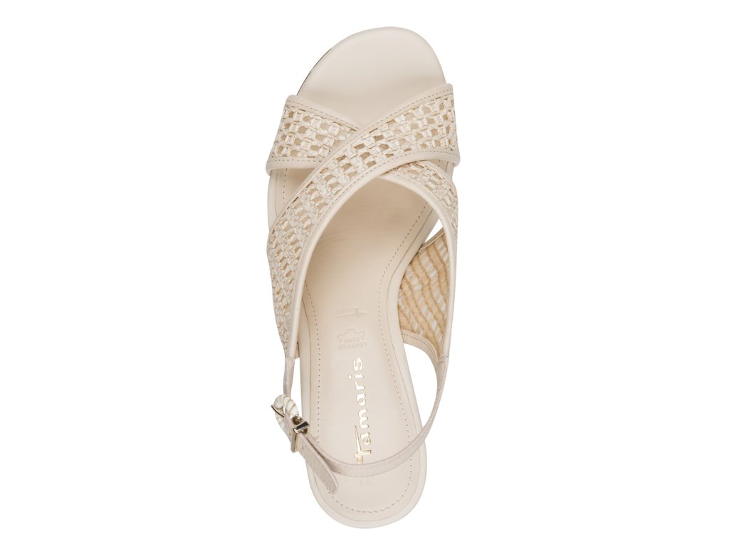 Dámské sandály Tamaris s křížovými pásky s opleteným vzhledem a nastavitelným páskem kolem kotníku se zlatavou přezkou, která zajišťuje dokonalé přizpůsobení.