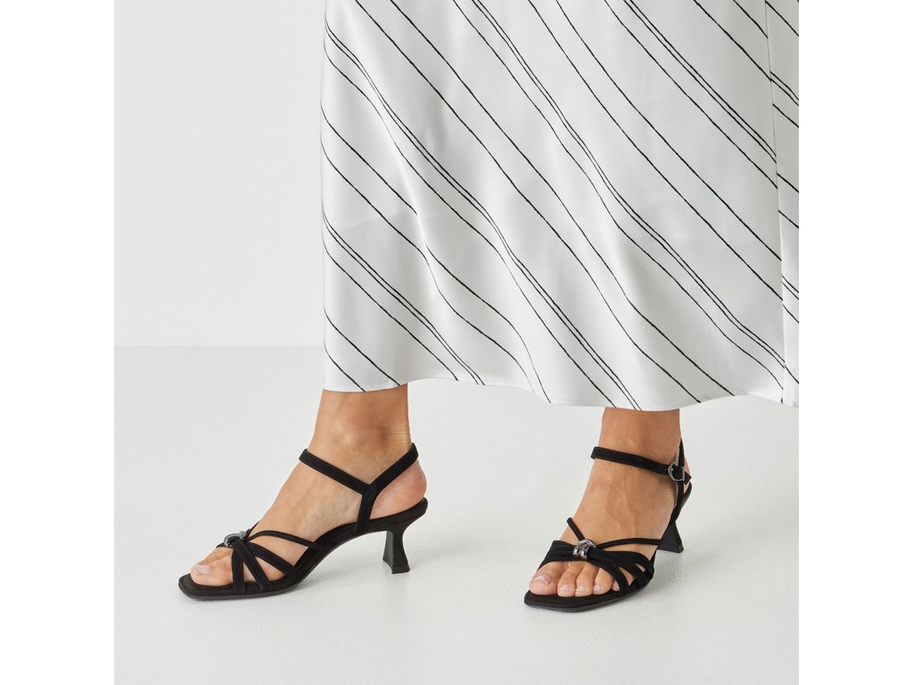 Dámské sandály Tamaris s tenkými překříženými pásky a nastavitelným páskem kolem kotníku se stříbrnou přezkou.