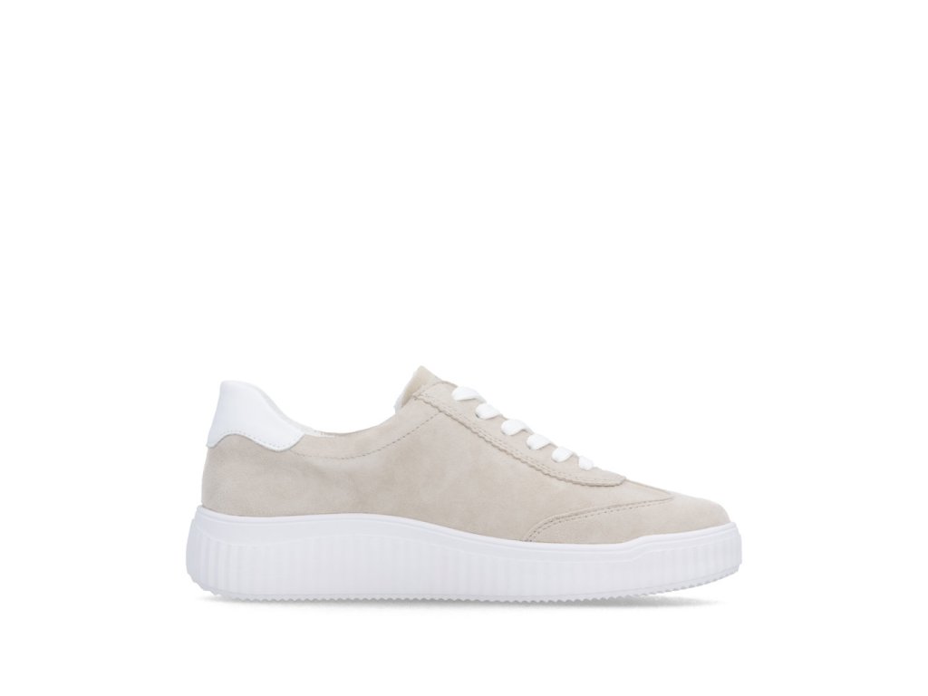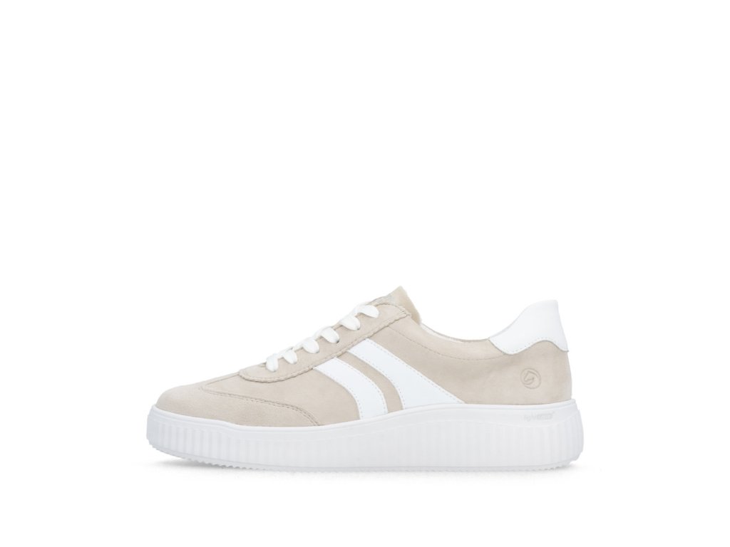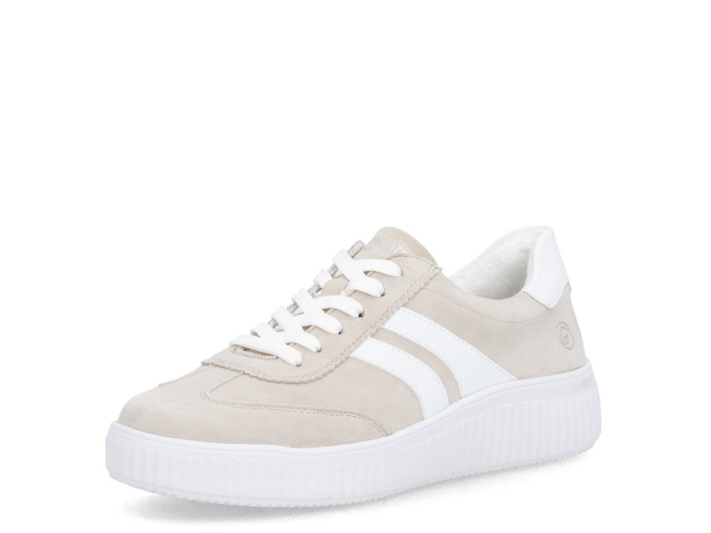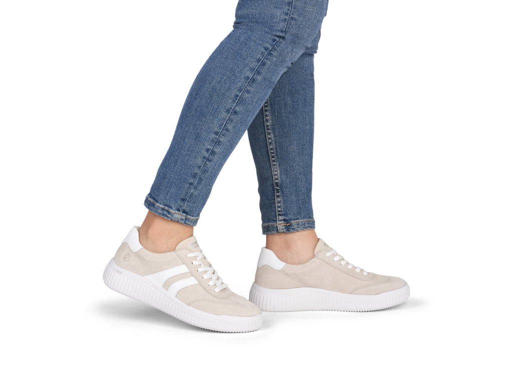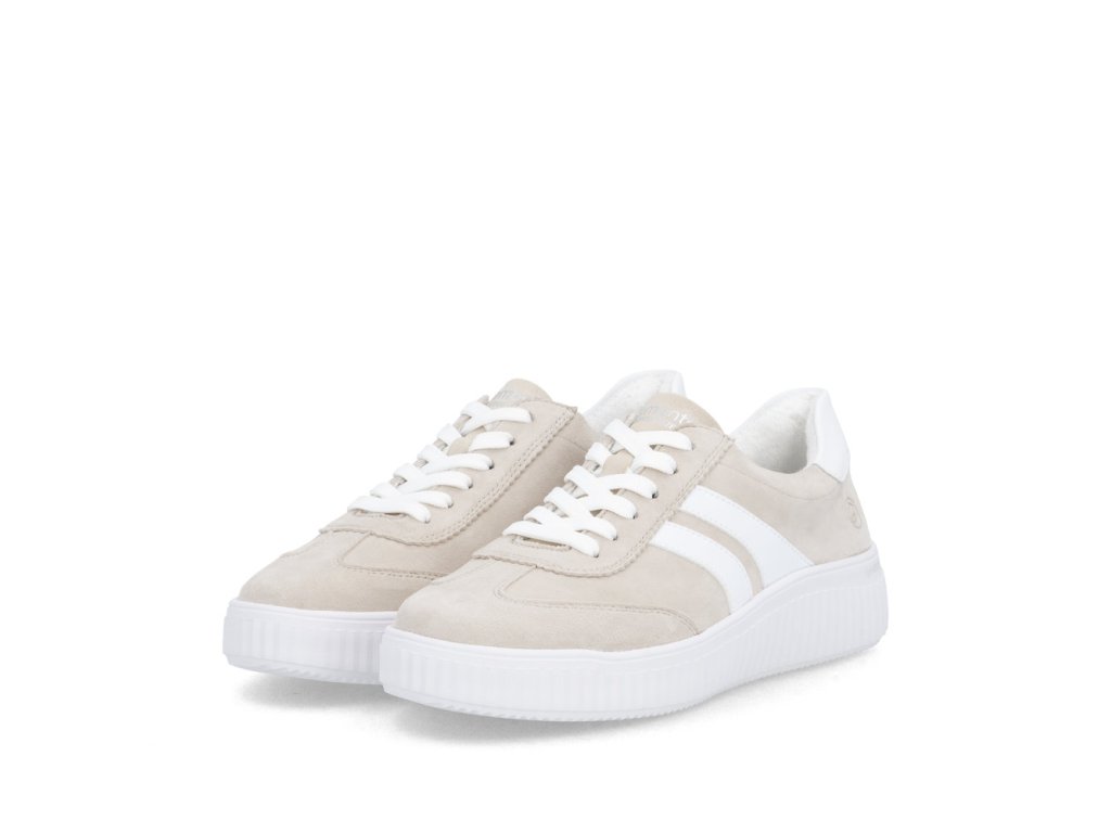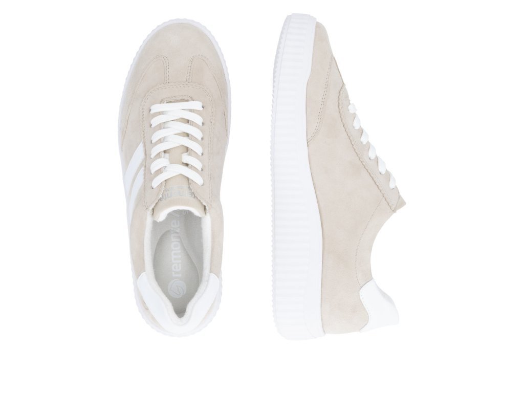 Dámské tenisky Remonte D3E00-60 v béžovo-bílé kombinaci nabízí čistý moderní vzhled a kvalitní semišový svršek.