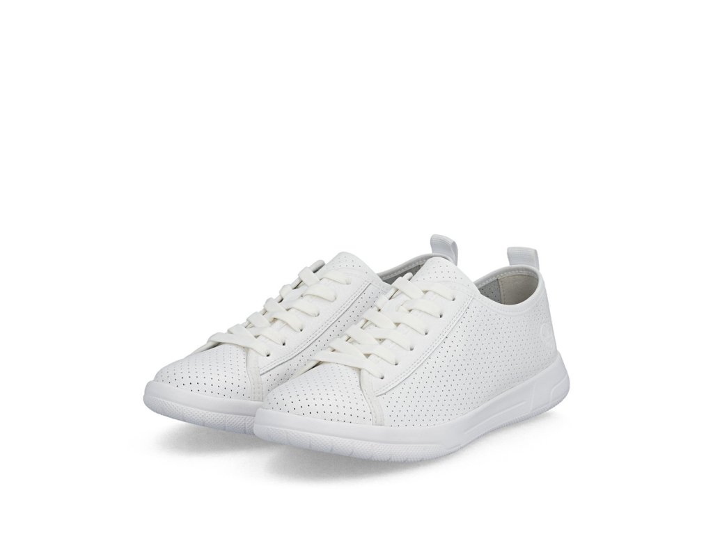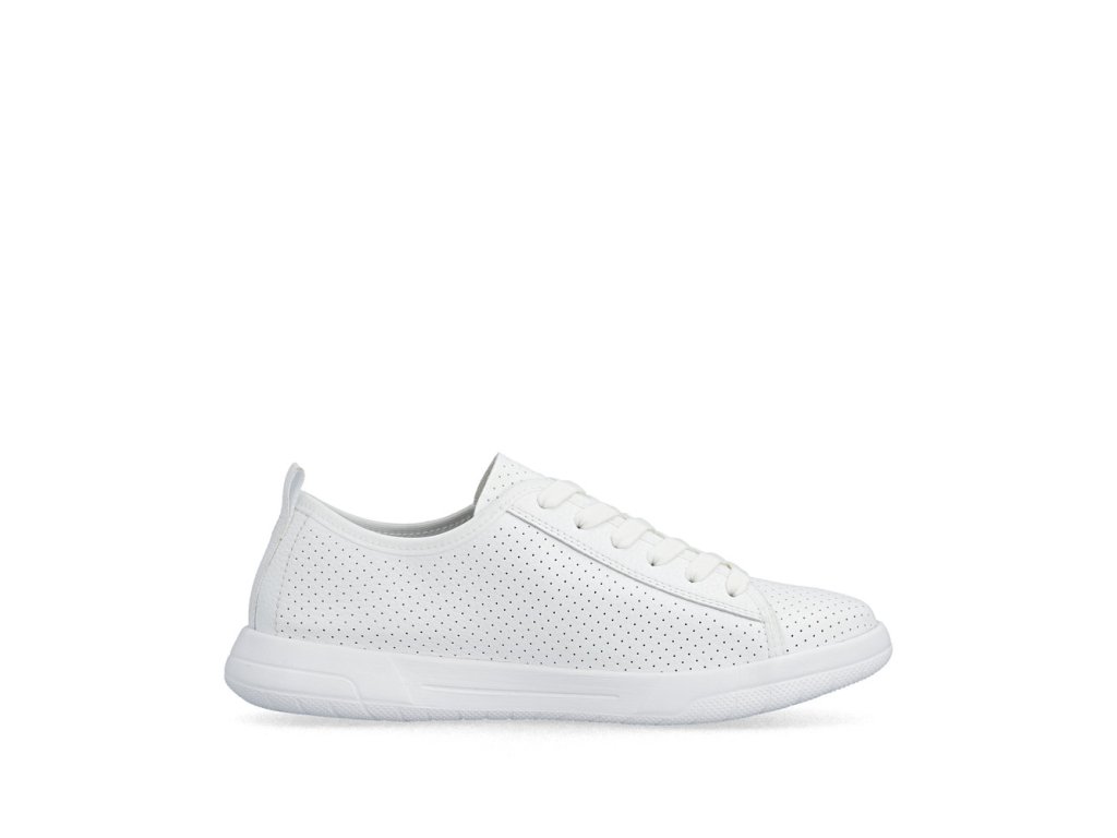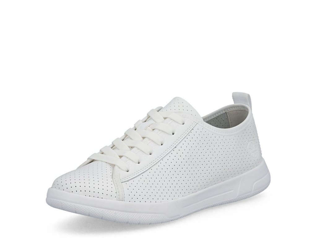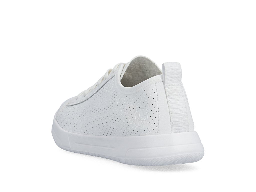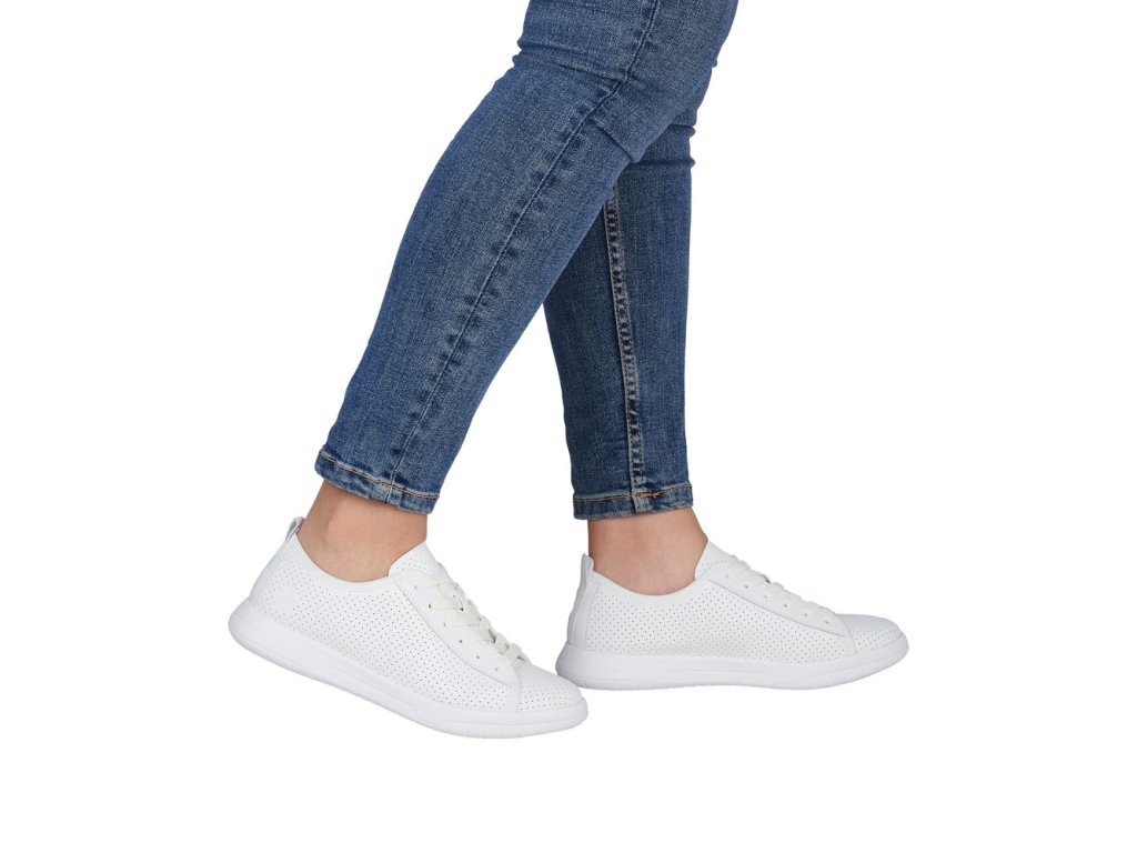 Dámské tenisky Rieker 45602-80 v čistě bílém provedení působí lehce, svěže a velmi univerzálně. Jemně perforovaný svršek z pravé kůže zajišťuje lepší prodyšnost a pohodlí i při celodenním nošení. Nízká, lehká podešev spolu s měkkou vyndavací stélkou vytváří komfortní obuv ideální na město, cestování i každodenní pochůzky.