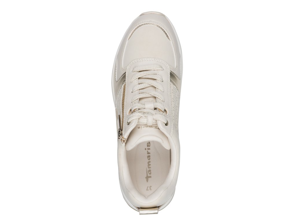 Dámské tenisky Tamaris v béžové barvě s lesklými zlatými detaily, šněrováním a funkčním zipem na vnější straně pro snadné obouvání.
