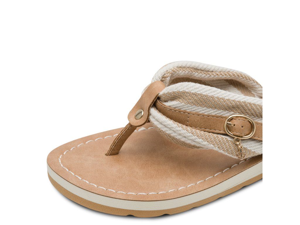Dámské žabky Tamaris s pruhovaným textilním páskem doplněným drobnou kovovou sponou.