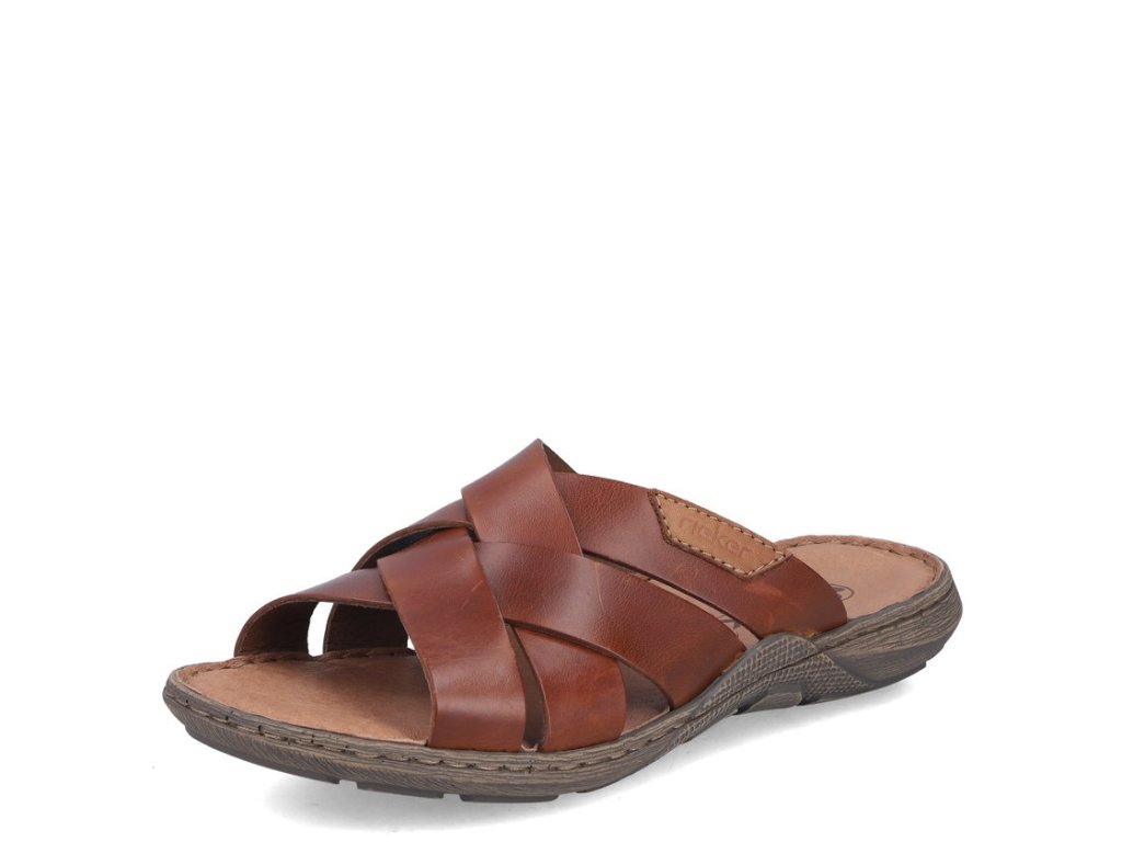 Pánské pantofle Rieker 22092-24 na pohodlné platformě. Pantofle mají hnědý vzor s překříženými pásky. Jsou ideální ke každodennímu nošení.