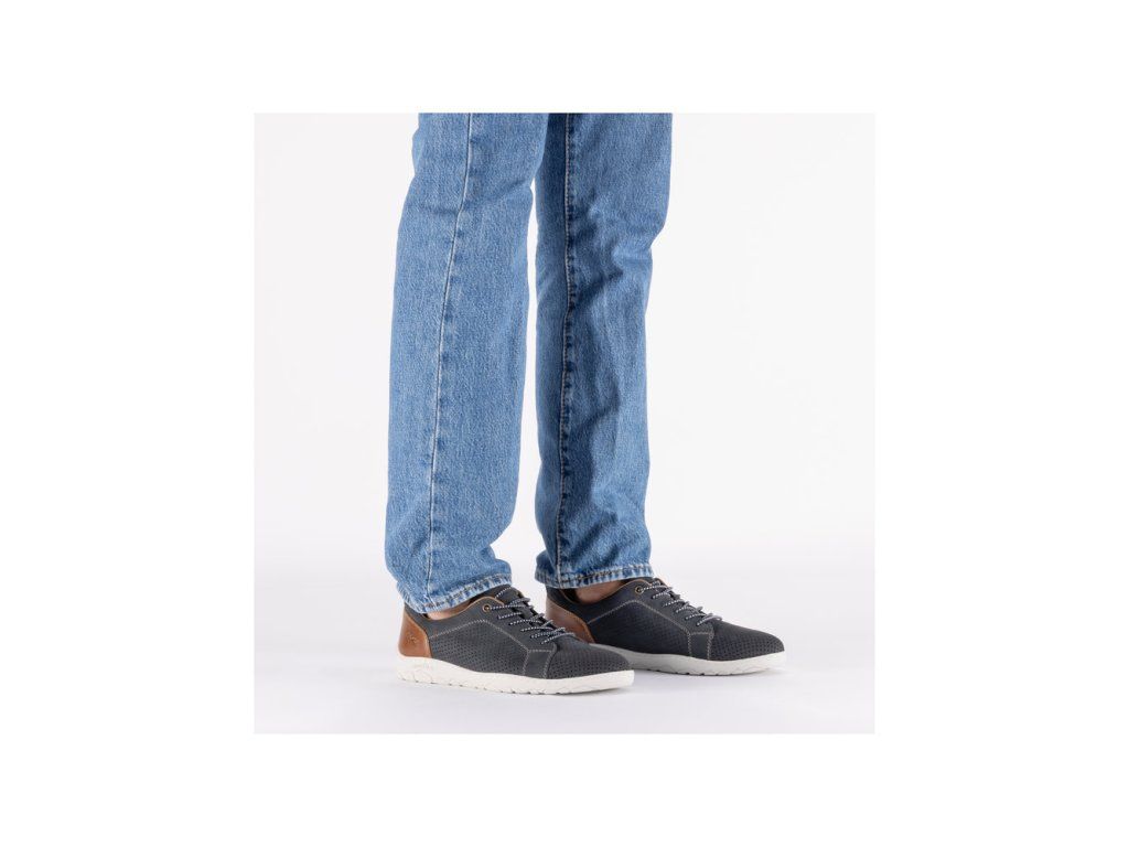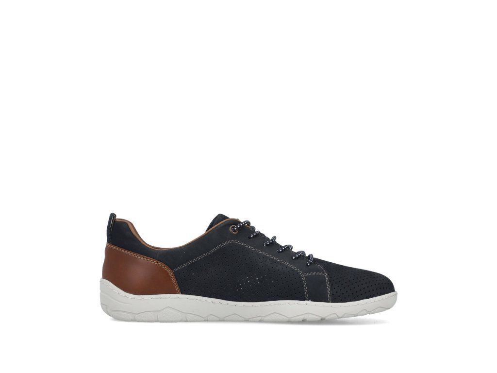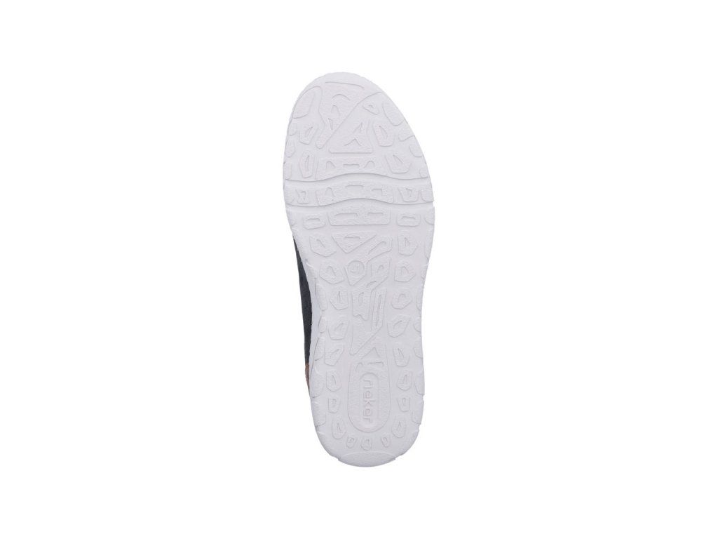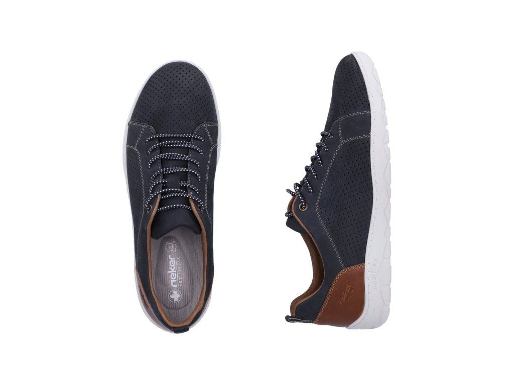 Pánské polobotky Rieker 08315-14 na pohodlné platformě s modrým vzorem. Díky perforovanému vzoru odvětrávají nohu. Jsou ideální pro každodenní nošení.