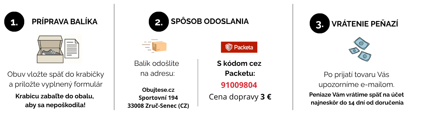 Obuv vložte späť do krabičky a priložte vyplnený formulár. Krabicu zabaľte tak, aby sa nepoškodila! Tovar je možné vrátiť akýmkoľvek dopravcom na adresu: Obujtese.cz, Sportovní 194, 33008 Zruč-Senec (CZ) alebo ZADARMO cez Packetu.