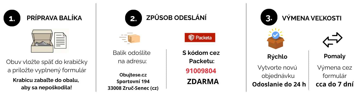 Vyplňte formulár s výmenou veľkosti a odošlite tovar cez Packetu zdarma. Výmena prebehne cca do 7 dní v závislosti od dopravcu.